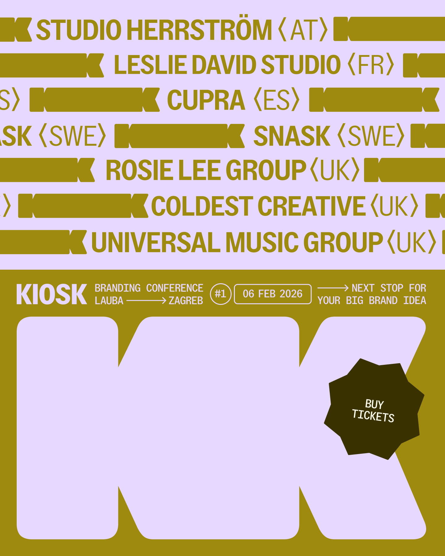 Ovo predavanje neće ponuditi prijedlog, ali se nadamo da će ponuditi korisne pojmove, nekoliko provokacija i dozu optimizma za snalaženje u našoj zajedničkoj, neizvjesnoj budućnosti – ne samo za brendove, nego i za ljude koji ih vode i za svijet u cjelini”, poručuju suosnivač i vlasnik Mark Fleming, te CEO Russell Clayton iz Rosie Lee Groupa. Uz Rosie Lee, na KIOSK dolaze i Leslie David Studio, koji stoji iza identiteta za Glossier i kampanja za Zaru, Pradu, Givenchy i druge; SNASK, švedski kolektiv koji ruši granice između dizajna, performansa i komunikacije za klijente poput Mete, Klarne, Curaproxa i Xboxa; te Studio Herrström, koji su svoj The Echo™ pristup procesu dolaska do ideje dosad primijenili u saradnjama sa Spotifyjem, Discordom i Sony Musicom.
